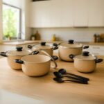 Jogo Conjunto De Panelas 5 Peças Caçarolas Teflon Antiaderente Kit Tampa De Vidro Cor Marfim
