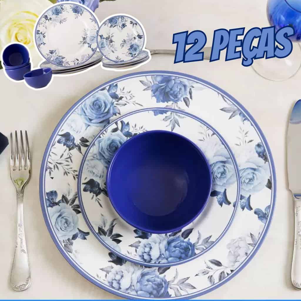 Aparelho de Jantar 12 Peças Alleanza Cerâmica Branco e Azul Redondo Antique