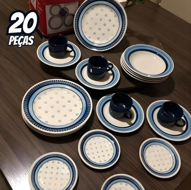 Aparelho de Jantar e Chá 20 Peças Biona de Cerâmica – Redondo Branco e Azul Donna