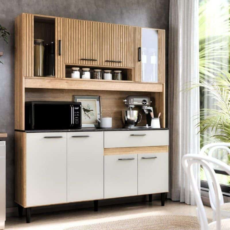 Armário De Cozinha Completo Coral 120cm Carvalho Off White Com Balcão E Paneleiro 8 Portas 1 Gaveta Nicho Para Microondas Moderno Compacto Para Cozinha Pequena MDP MDF