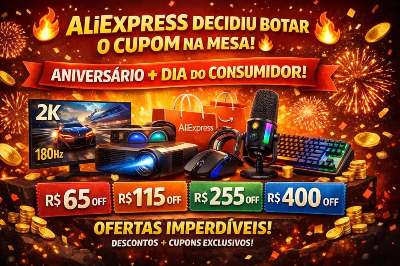 O AliExpress entrou forte na Semana do Consumidor 2026 e o cenário ficou ainda mais interessante porque o período coincide com o aniversário da plataforma, uma das campanhas mais importantes do ano para quem acompanha eletrônicos, periféricos, projetores, smartwatches, teclados, mouses e acessórios de setup. Fontes que acompanham o calendário promocional do marketplace apontam que a campanha de aniversário de 2026 acontece entre 16 e 25 de março, com um aquecimento anterior para coleta de cupons e preparação do carrinho.