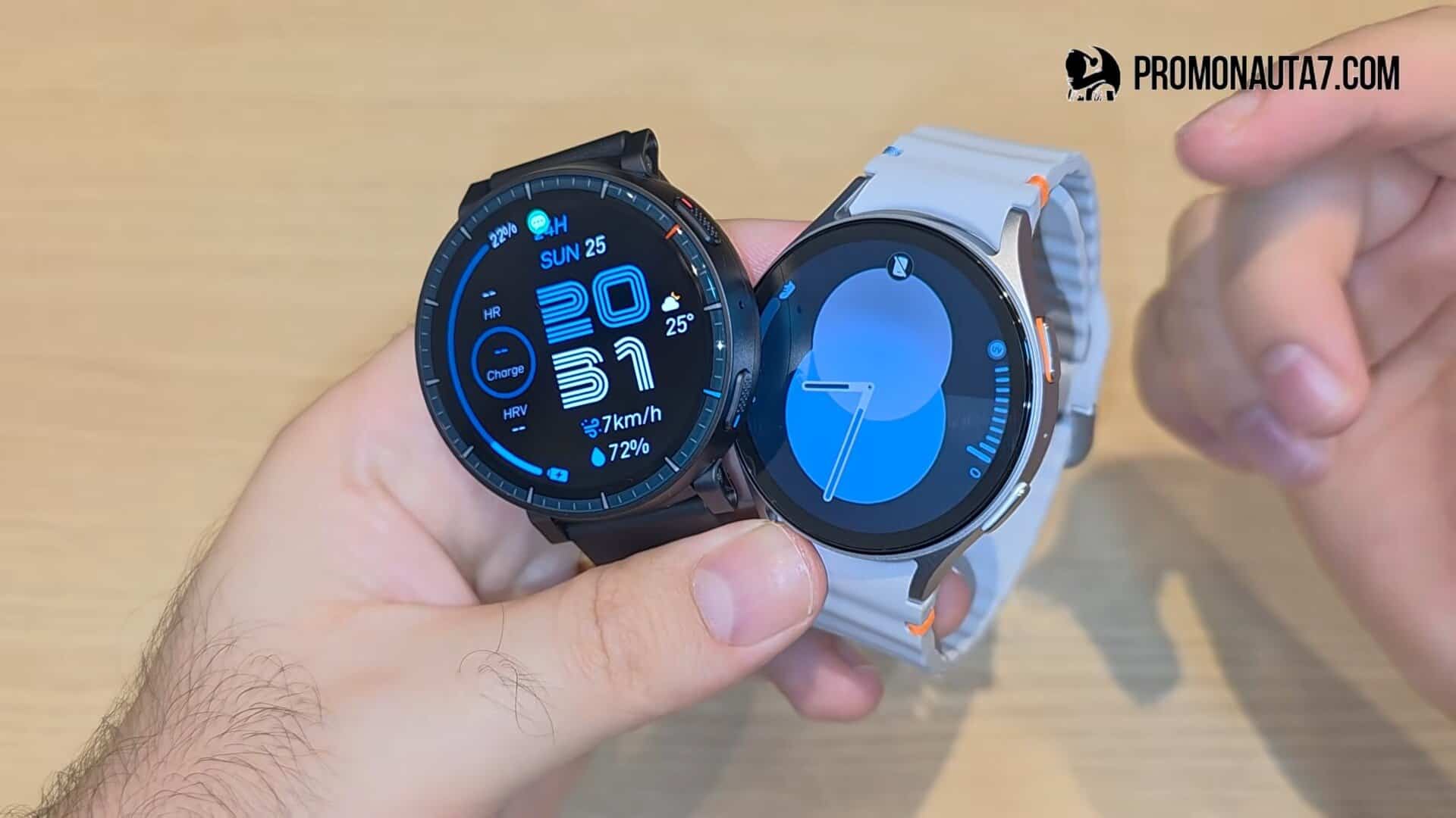 Em termos de tamanho, os dois smartwatches são bastante próximos. O Galaxy Watch 7 analisado é a versão de 44 mm, enquanto o Amazfit Active Max aposta em um visual esportivo moderno, com acabamento bem refinado para sua categoria.