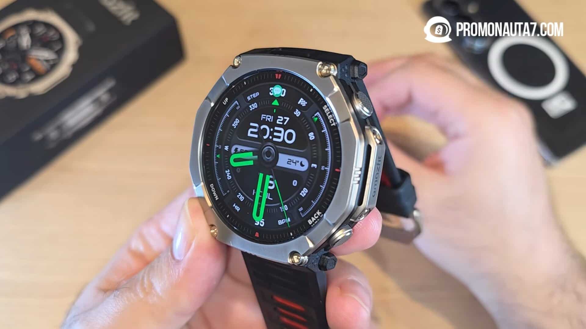 O grande destaque do Amazfit T-Rex Ultra 2 está na sua construção extremamente robusta.