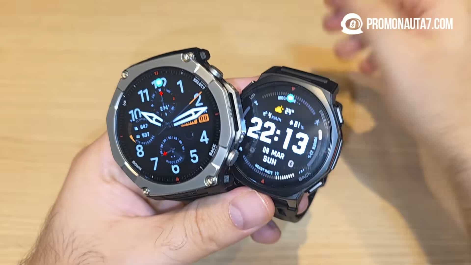 O Amazfit T-Rex Ultra 2 é um smartwatch robusto, pensado para quem gosta de relógios grandes e extremamente resistentes. Já o T-Rex 3 Pro 44mm segue um conceito mais minimalista e confortável para o uso diário.