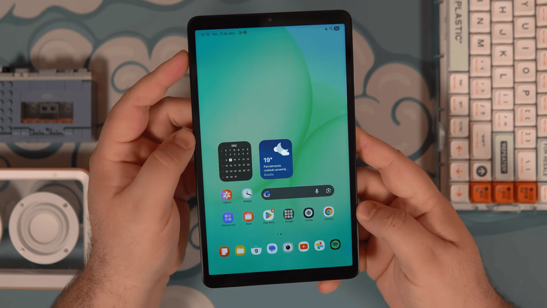 É aquele conjunto “sem luxo”, mas funcional. A proposta aqui é ser um tablet acessível, leve e prático.