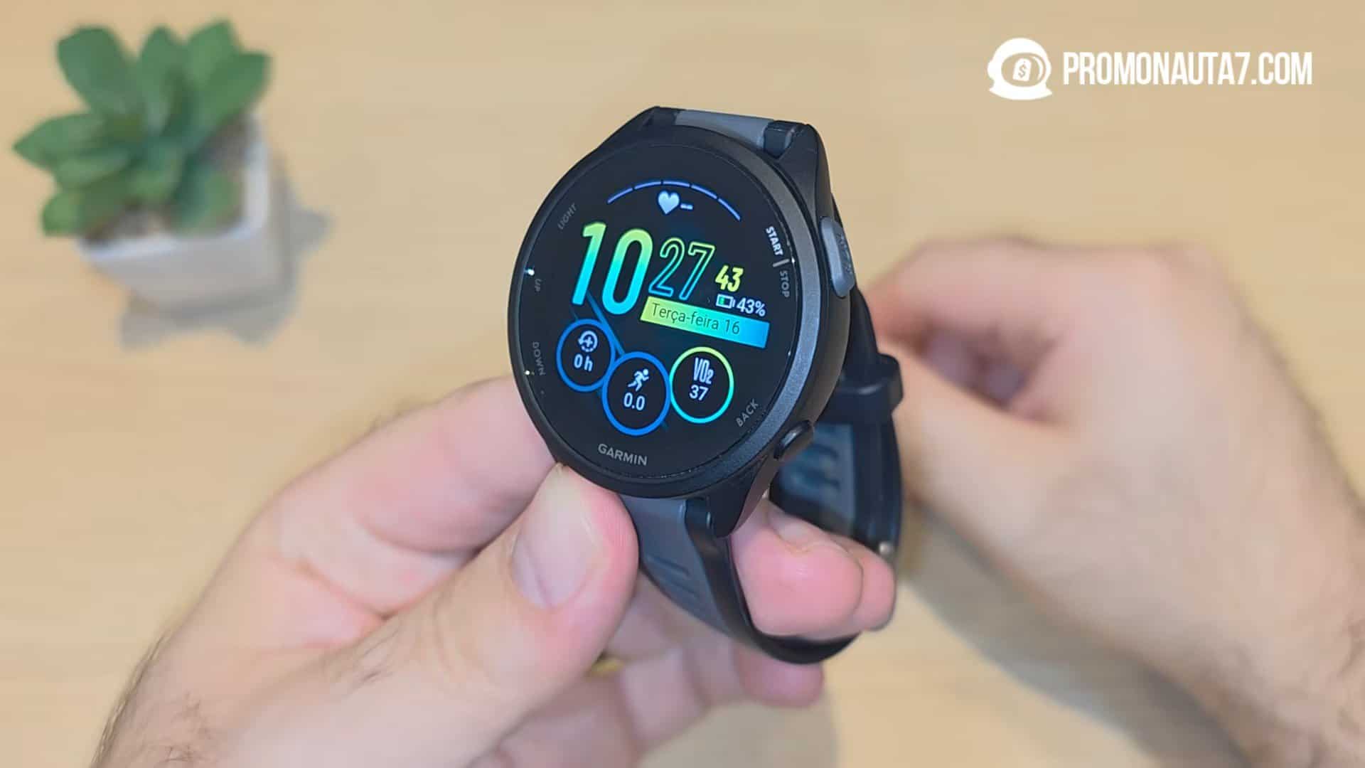 Muitos modelos nessa faixa da Garmin ainda utilizavam telas transflectivas no passado. Aqui você já tem AMOLED, com visual moderno e ótima legibilidade.
