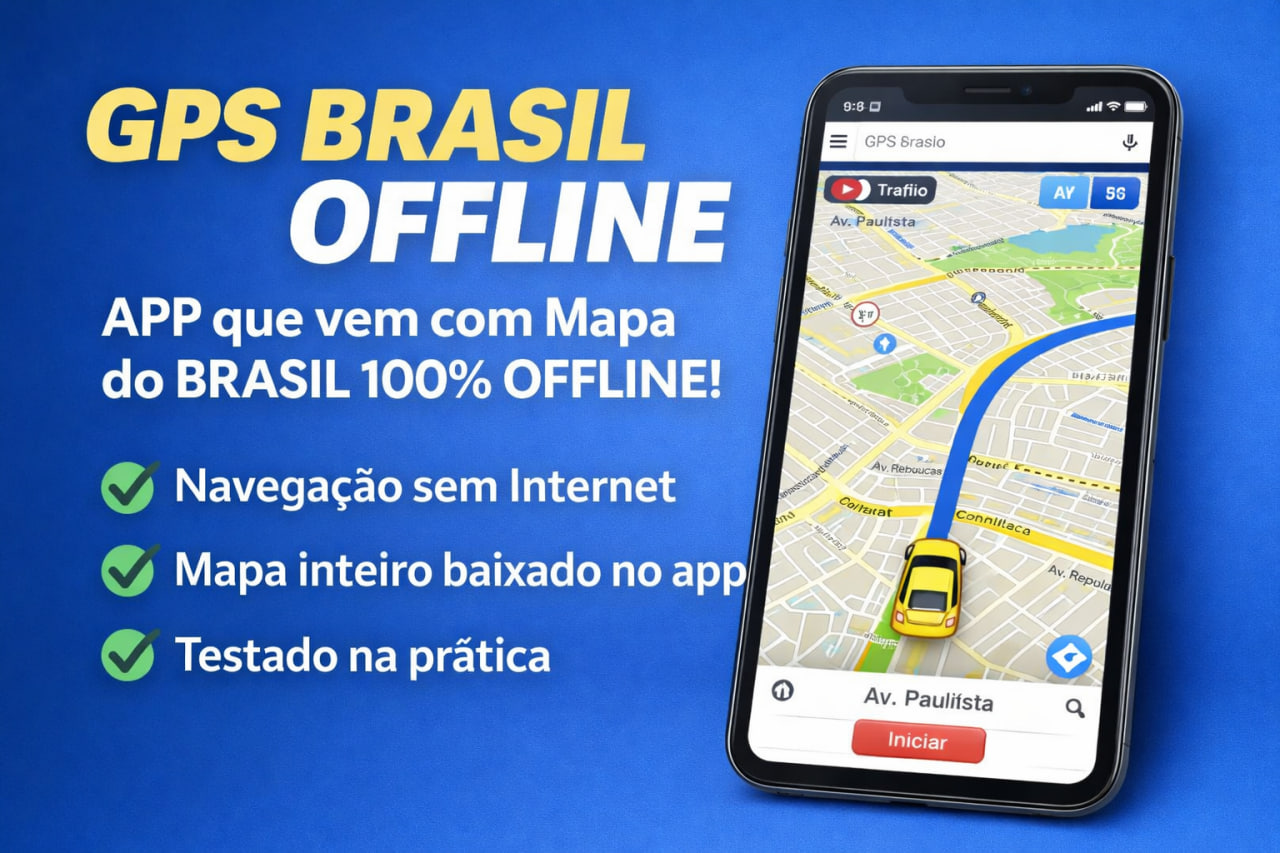 O GPS Brasil é um aplicativo de navegação que já vem com o mapa do Brasil inteiro instalado e funciona 100% offline desde o primeiro uso. A proposta é bem direta: servir como alternativa quando você está sem sinal de internet, viajando por áreas com cobertura fraca ou quer evitar depender de dados móveis. Como o mapa já vem embutido, o app é pesado (mais de 1 GB), mas em troca você não precisa baixar mapas por região nem configurar downloads adicionais.