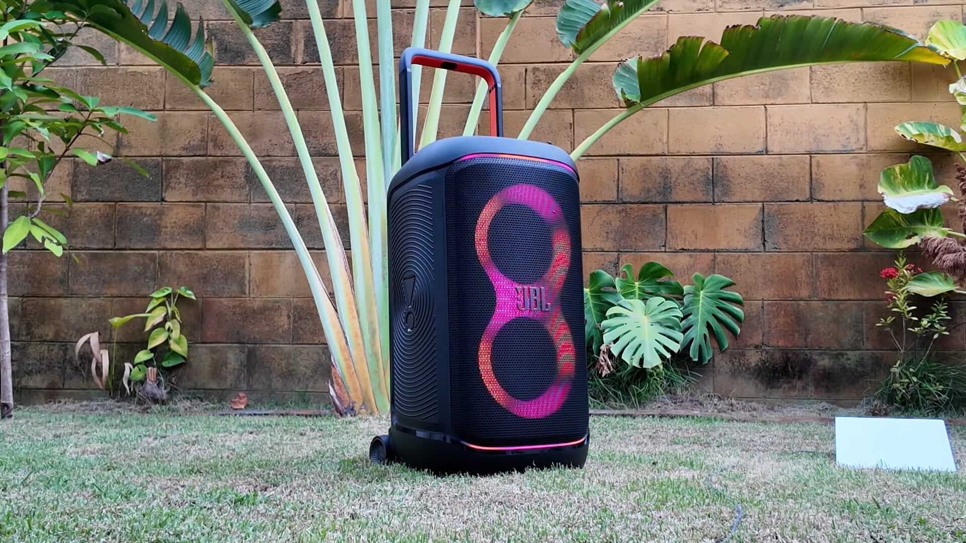 O acabamento segue o padrão premium da linha PartyBox, com construção reforçada, grade frontal metálica e boa sensação de resistência. A parte superior concentra os controles físicos, enquanto a traseira traz a alça retrátil e as conexões protegidas.