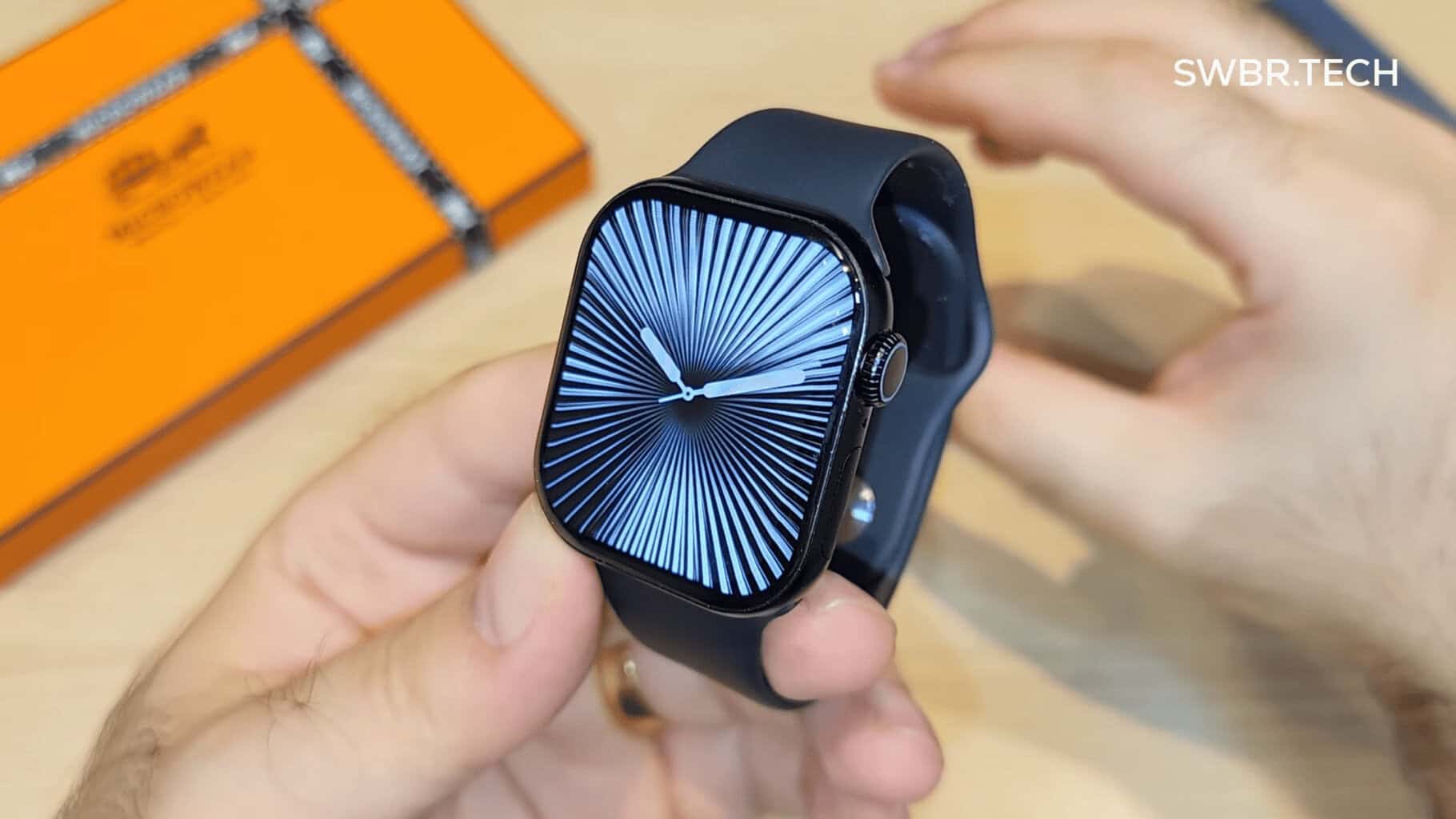 Para quem tem pulso pequeno, o efeito visual é excelente: a tela “enche” bem a frente do relógio, sem aquela sensação de bordas grossas de modelos mais simples.