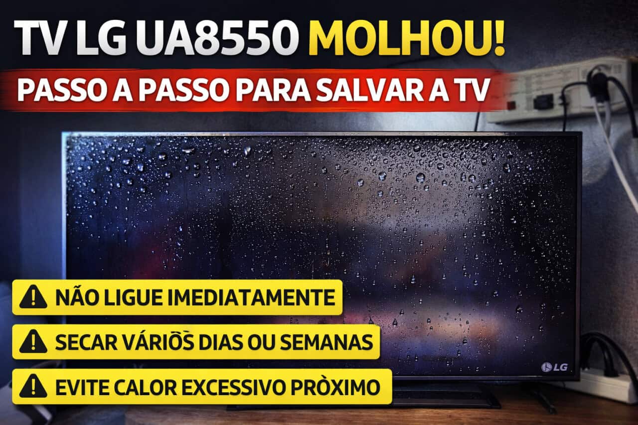 Uma TV LG UA8550 acabou molhando por causa de uma goteira e foi necessário tomar algumas medidas para evitar que o aparelho queimasse ou ficasse danificado. O principal cuidado foi não ligar a TV imediatamente, deixando o equipamento secar completamente por cerca de duas semanas antes de testar.