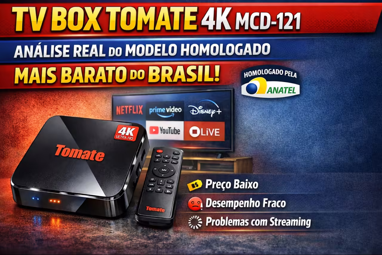 A Tomate MCD-121 é uma TV Box baseada em Android, projetada para oferecer funções básicas de smart TV, como acesso ao YouTube, Play Store e alguns aplicativos de streaming. Seu grande diferencial é unir preço baixo + homologação Anatel, algo raro nessa faixa de valor.