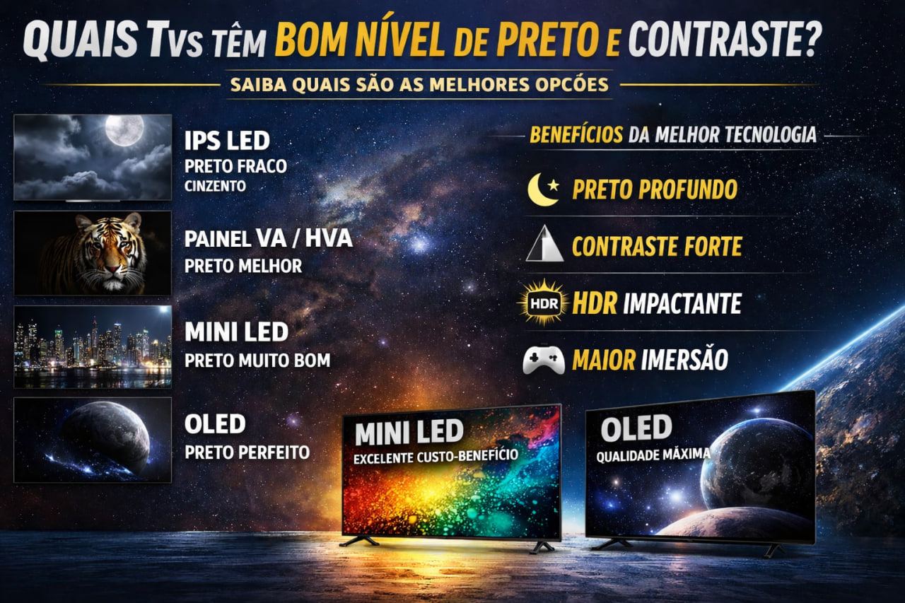 Neste guia completo você vai entender quais tipos de TV entregam o melhor nível de preto, quais modelos valem mais a pena e quais tecnologias realmente fazem diferença na qualidade da imagem.