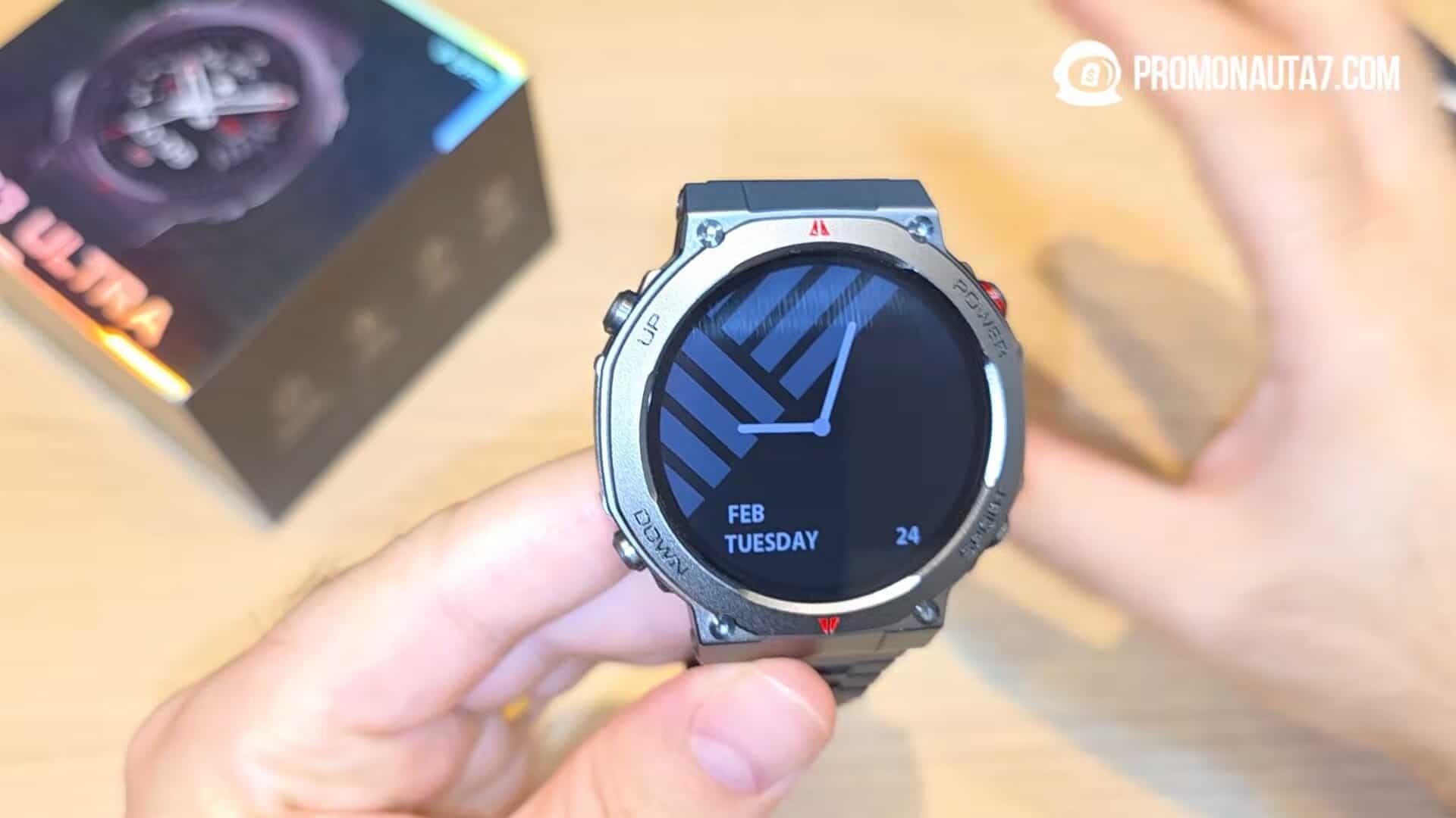 A construção é totalmente em metal, com acabamento robusto e botões laterais reforçados. É um smartwatch claramente voltado para quem busca durabilidade e uso esportivo intenso.