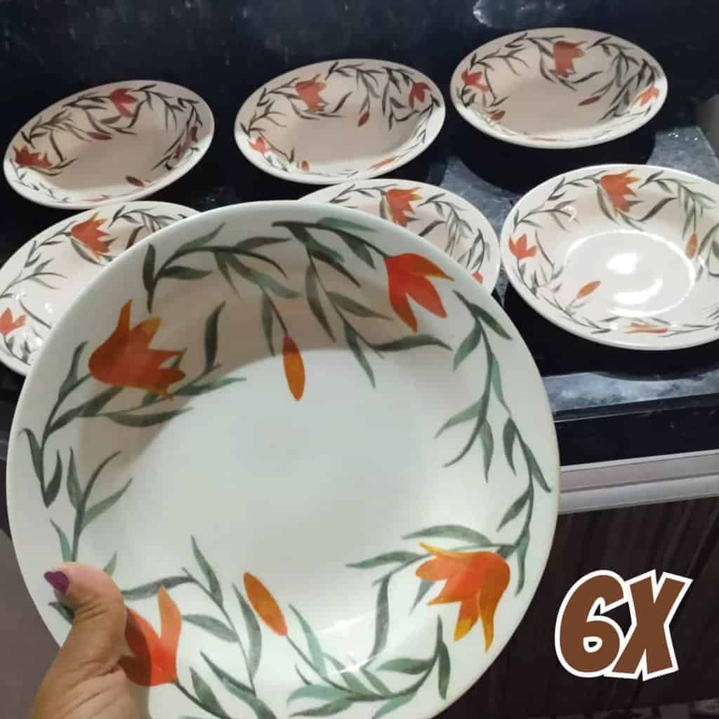 Conjunto De 6 Pratos Fundos 21,5 Cm Donna Lírios Biona Cor Verde, Laranja e Off White Florido