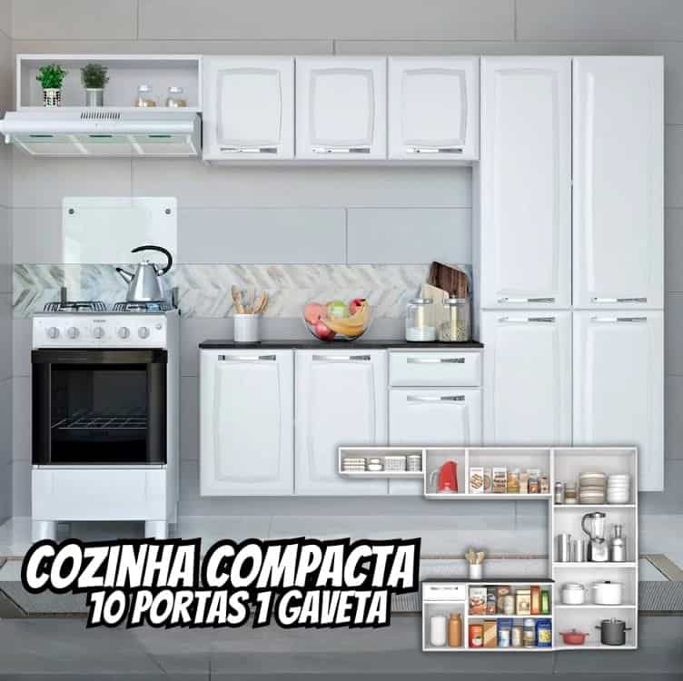 Cozinha Compacta Itatiaia Amanda Plus com 10 Portas, 1 Gaveta e 8 Prateleiras – 245cm de largura – Branco Neve