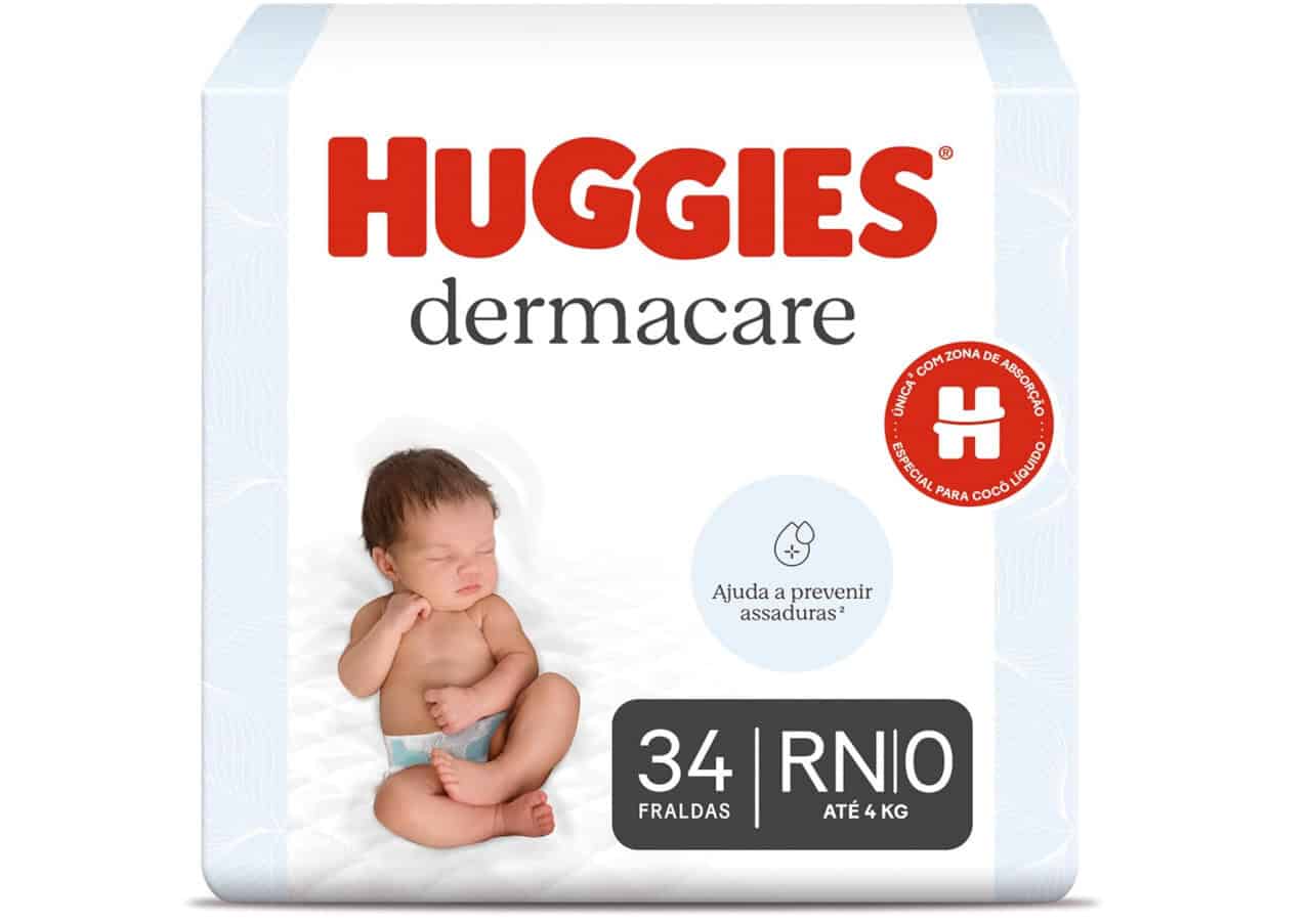 Fralda Huggies Premium Dermacare Tamanho RN – 34 Fraldas Premium com Tecnologia Avançada para Pele Sensível do bebê que ajuda previnir assaduras