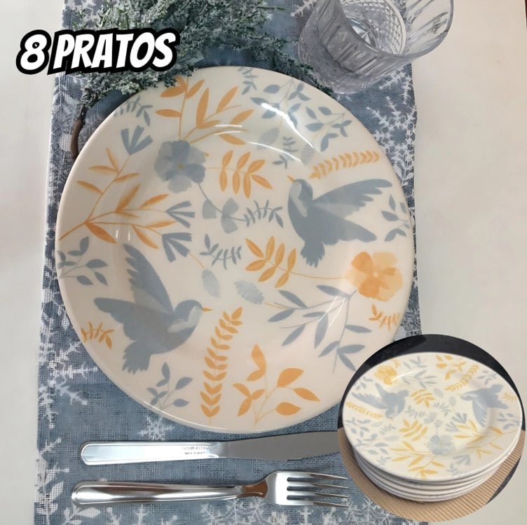 Jogo 6 Prato De Sobremesa 18 Cm Bem Te Vi Bionna Cor Cinza, Amarelo e Off White Florido pássaros