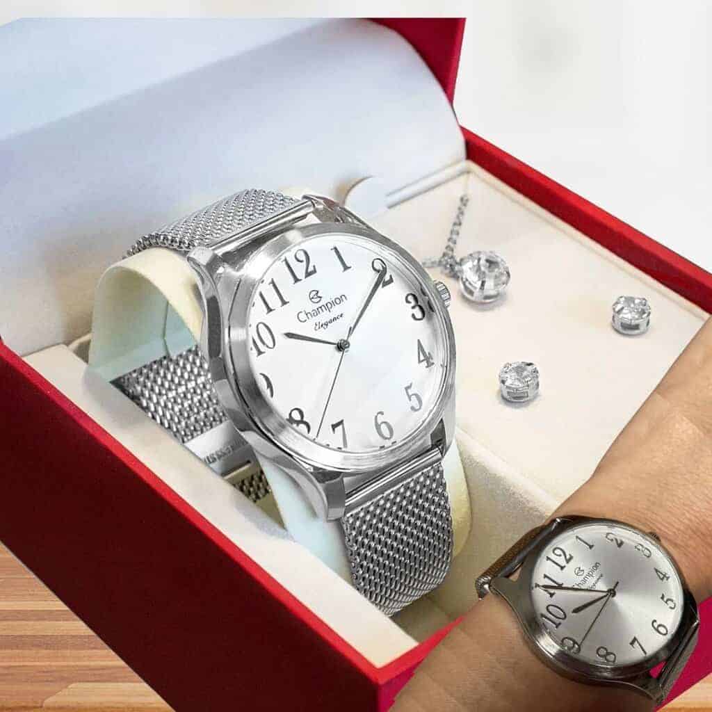Kit Relógio Champion Feminino Barato Colar E Brincos Prateado Prata
