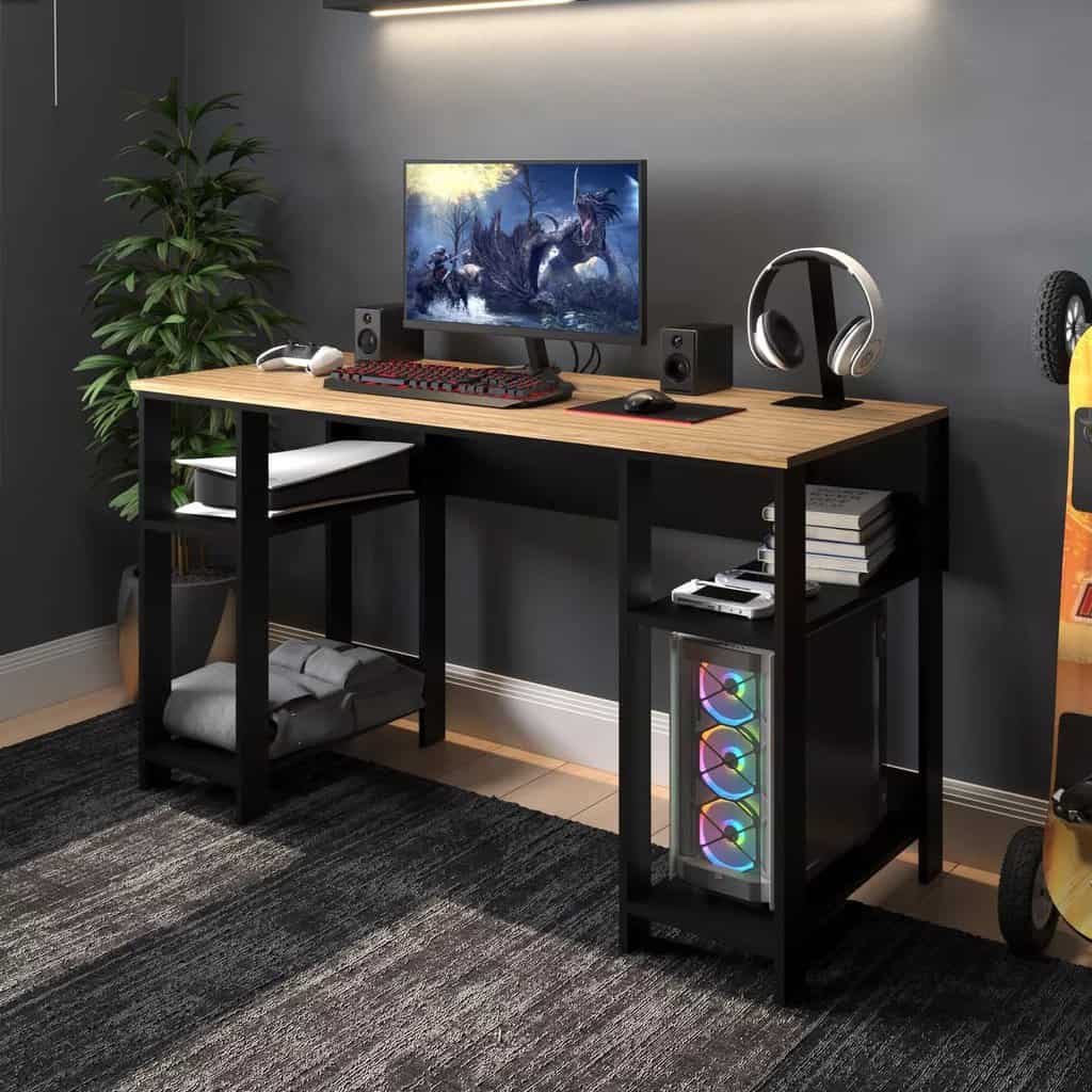 Mesa Escrivaninha Gamer Madeira Industrial Geek – Laminado Com Preto Para Home Office