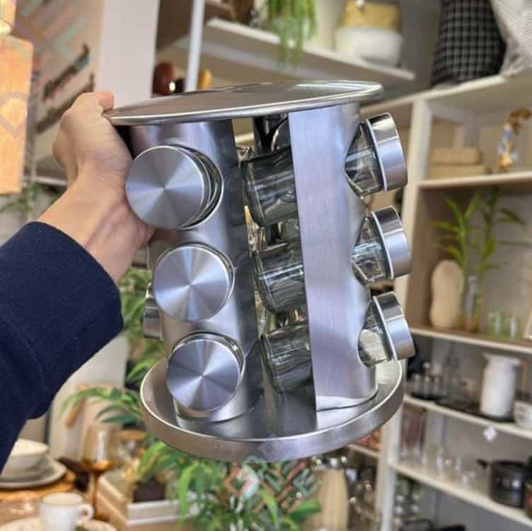 – Porta Tempero Giratório 360 com 12 potes vidro suporte inox