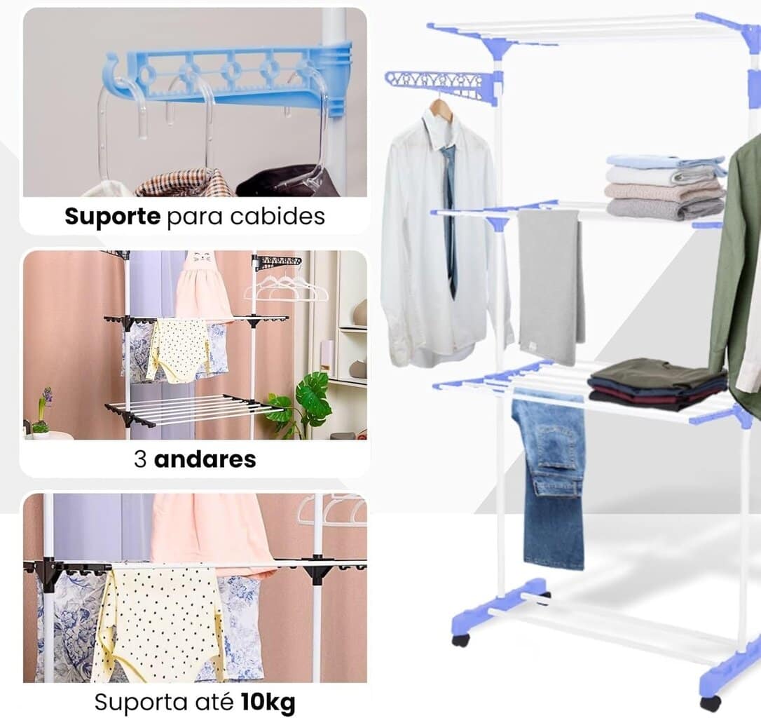 Super Varal de Chão Grande 3 Andares Regulável Dobrável Com Rodas Camiseta Toalha Calça